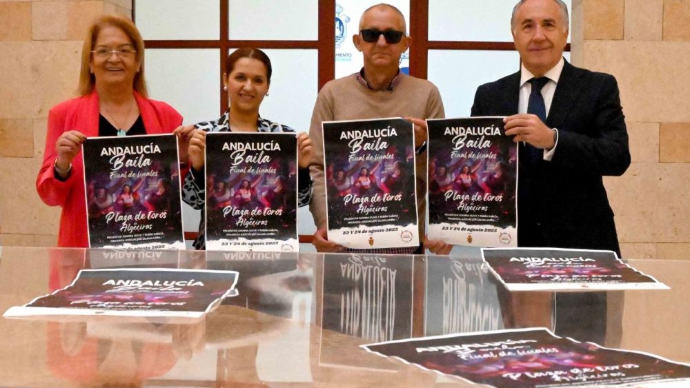 El alcalde de Algeciras, José Ignacio Landaluce, junto a la teniente de alcalde delegada de Feria y Fiestas, Juana Cid, así como los representantes de la Asociación Salmalandia, Salvador Lobato Puyol y Doro El Fazzazi, han presentado el cartel del concurso ‘Andalucía Baila’.