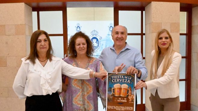 El alcalde, José Ignacio Landaluce, acompañado por la concejal delegada de Comercio, Sabina Quiles, la presidenta de la Asociación de la Pequeña y Mediana Empresa de Algeciras, Paca Ríos, y la vocal de Aymeal-Hostelería, Toñi García, ha presentado el cartel de la V Feria de la Cerveza, que comienza hoy y en la que participan varios establecimientos hosteleros de la ciudad.