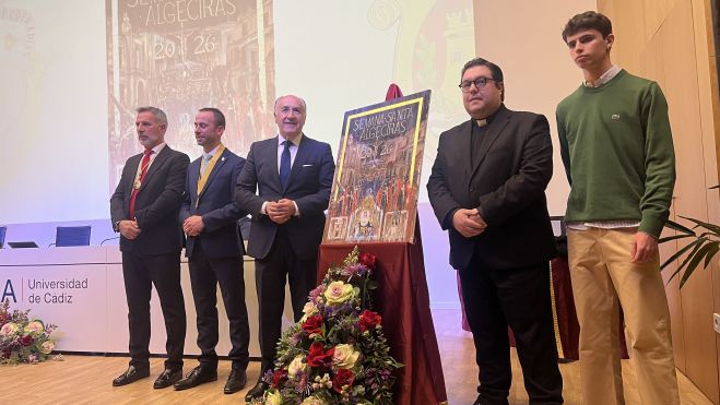 El acto de presentación del cartel se ha celebrado en el Salón de Actos de la Escuela Técnica Superior de Ingeniería de Algeciras este viernes 16 de enero a las 20.00 horas. Durante el evento se ha hecho entrega de la Palma Cofrade 2026 a la asociación Tertulia Cofrade 'La Levantá' y por otro lado, se han otorgado tapas al pregonero de este año Jorge Juliá Aguilera.