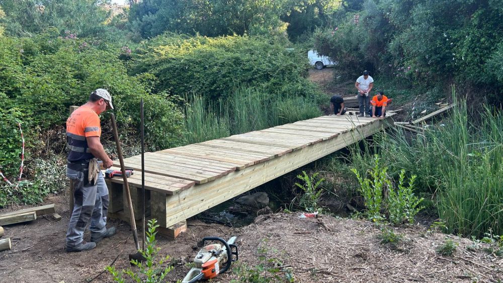 El Ayuntamiento de Algeciras ha comenzado los trabajos de protección en el río Pícaro, consistentes en la instalación de paso sobreelevado provisional y escalera de madera, alternativos a la pasarela cerrada por daños en su cimentación causados por la últimas lluvias torrenciales y que comunica la urbanización Los Camarotes de Getares con la calle Orión y la playa.