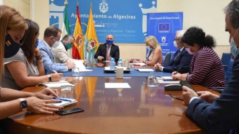 El alcalde, José Ignacio Landaluce, acompañado de la delegada de Hacienda, María Solanes y de Empleo, Monserrat Barroso, ha mantenido un encuentro de trabajo esta mañana en el Ayuntamiento con representantes de la Junta de Andalucía, el Puerto, la Cámara e Comercio y la Confederación de Empresarios de Cádiz (CEC) para tratar el desarrollo e impulso de los proyectos en los que están implicados dichas administraciones y que, según dijo, "potenciarán el futuro de Algeciras".