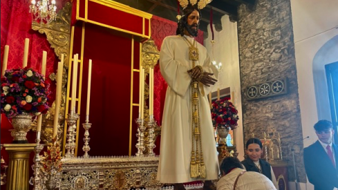 Ochenta años desde que el Señor Cautivo, tallado por Carlos Bravo Nogales, llegó al barrio de San Isidro de Algeciras. Este es uno de los motivos por el que el Señor Cautivo está ataviado con una túnica blanca, como podrán contemplar si van a visitarle en la capilla. "Ochenta años desde que llegó a su barrio. Don Carlos Bravo hizo esta preciosa talla y por eso hemos querido vestirlo hoy de blanco, con la túnica que se restauró y que luce muy guapo con su tez morena", especifica el hermano mayor de la Hermandad del Medinaceli. De cara al Martes Santo porta un escapulario nuevo donado por la cuadrilla de capataces y costaleros, realizada por el taller de bordados de Dolores Fernández en Brenes (Sevilla). "Es una joya y es muy bonito que los costaleros se involucren y quieran regalarle al Cristo", añade Ocaña con una sonrisa.
