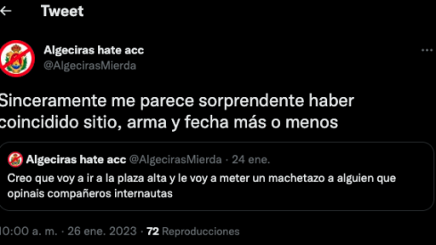 La Brigada Local de Investigación de la Policía Nacional de Algeciras investiga la cuenta de un usuario de Twitter quien el pasado 24 de enero escribía el siguente tuit: "creo que voy a ir a la Plaza Alta y le voy a meter un machetazo a alguien. ¿Qué opináis compañeros internautas?". Su usuario en esta red social es 'Algeciras Hate acc' e incluso ha fijado este mensaje en su muro.