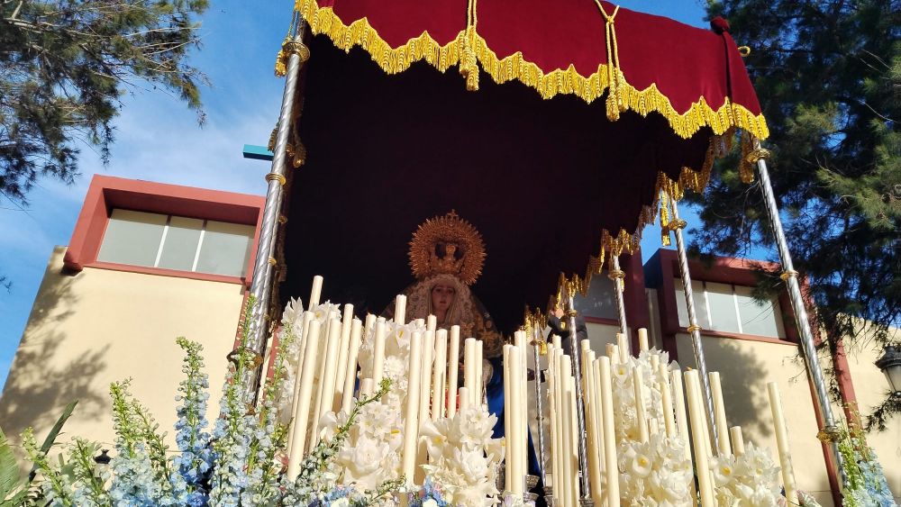 El paso, ya de palio, ha salido a ruedas por la rampa de la iglesia. Luego fuera cada costalera ha ocupado su lugar para que la Virgen de la Trinidad junto al Cristo de las Tres Caídas paseen el orgullo de todo un barrio por Algeciras, en el recorrido más largo de la Semana Santa algecireña.