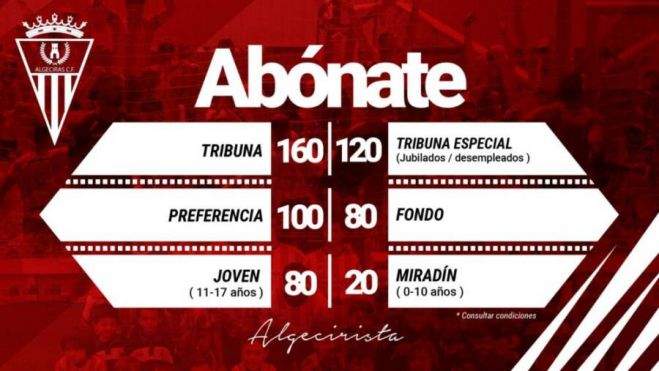 El Algeciras Club de Fútbol ha presentado hoy la campaña de captación de abonados para la incierta temporada 2020/2021. El club ha decidido mantener los precios del pasado curso: 160 euros en tribuna (120 para desempleados y jubilados), 100 euros en preferencia, 80 en fondos y para jóvenes de 11 a 17 años.
