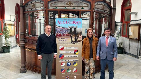 El alcalde de Algeciras, José Ignacio Landaluce, acompañado de la teniente de alcalde delegada de Feria y Fiestas, Juana Cid, junto con el empresario Carmelo García, ha presentado esta mañana el elenco de ganaderías de la Plaza de Toros de Algeciras de cara a la Feria Real, que tendrá lugar del 21 al 24 de junio.