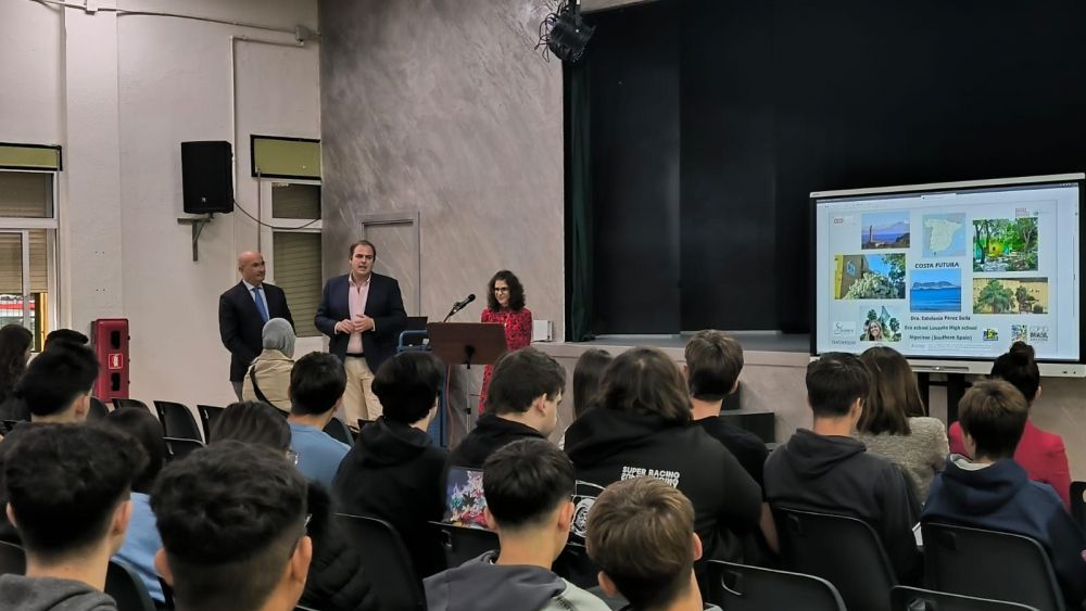 El teniente de alcalde delegado de Educación, Javier Vázquez, y el delegado de Parques y Jardines, Ángel Martínez, han asistido en el Institudo de Enseñanza Secundaria Levante a la proyección del cortometraje 'Costa Futura', proyecto seleccionado a nivel mundial para participar en la Teachers Cop, evento internacional organizado por la Office for Climate Education que se celebra en Brasil.