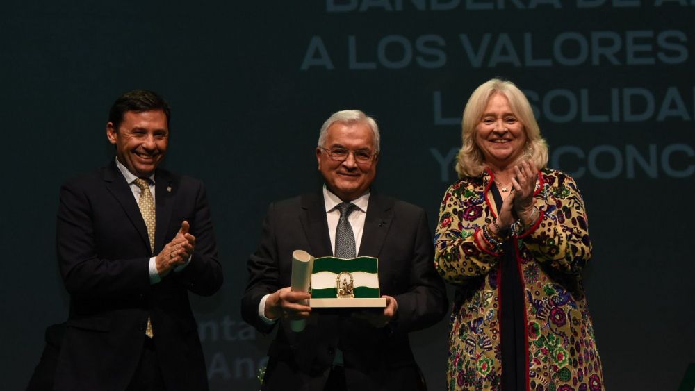 El consejero de Sanidad, Presidencia y Emergencias, Antonio Sanz, junto a la delegada del Gobierno de la Junta de Andalucía en Cádiz, Mercedes Colombo, ha presidido este lunes en Jerez el acto institucional de la entrega de Banderas de Andalucía en la provincia de Cádiz. El Padre Pedro, sacerdote en la barriada La Piñera, ha recibido la Bandera de Andalucía a los Valores Humanos, la Solidaridad y la Concordia.
