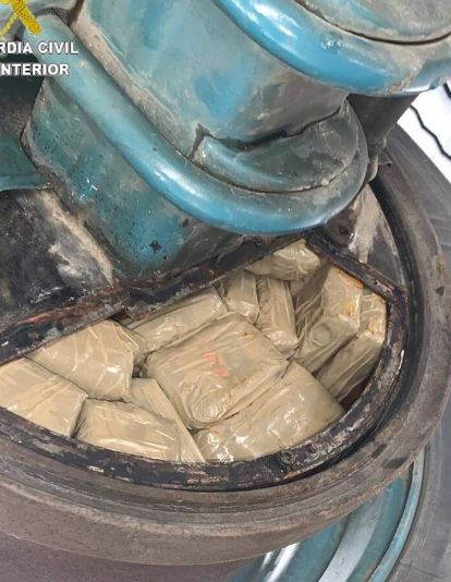 Procedieron a una laboriosa inspección del vehículo, apoyados por un componente del Servicio Cinológico, y se constató la existencia de varios espacios habilitados para transportar hachís en el interior de los tambores de freno del remolque.