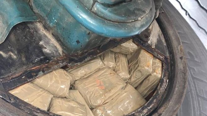 Procedieron a una laboriosa inspección del vehículo, apoyados por un componente del Servicio Cinológico, y se constató la existencia de varios espacios habilitados para transportar hachís en el interior de los tambores de freno del remolque.