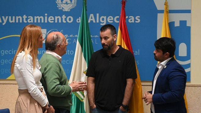 El alcalde, José Ignacio Landaluce, acompañado del teniente de alcalde delegado de Participación Ciudadana, Jorge Juliá, y de la concejal delegada de Hacienda, María Solanes, han recibido en la Casa Consistorial a Rubén Reina, padre de Roberto, un pequeño algecireño que lucha contra el síndrome de capos.