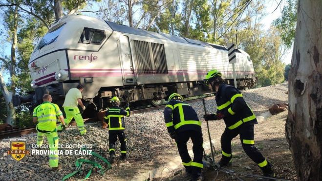 Bomberos de Jimena de la Frontera participaron junto a ADIF en la retirada de los animales de la vía y debajo de la máquina. La dotación de bomberos acudió con una autobomba rural pesada y un vehículo de mando.