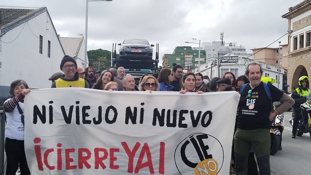 Miembros de diferentes colectivos sociales de la comarca y de la provincia han protagonizado una marcha de 6 kilómetros para rechazar la apertura del nuevo Centro de Internamiento de Extranjeros (CIE) en los terrenos de Botafuegos. La comitiva ha caminado desde el actual CIE, en La Piñera, hasta el nuevo, que abrirá próximamente en Botafuegos.