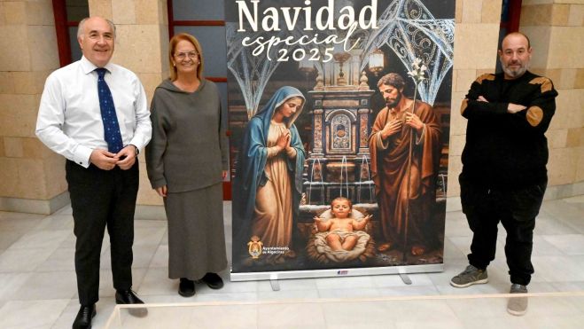 El alcalde, José Ignacio Landaluce, acompañado por la teniente de alcalde delegada de Feria y Fiestas, Juana Cid, y el presidente de la Federación de Rondallas 'El Almirez', José Antonio Aragón 'Tete' han presentado el cartel de la Navidad Especial 2025.