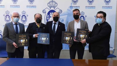 El alcalde, José Ignacio Landaluce, acompañado por el presidente del Consejo Local de Hermandades y Cofradías, Manuel Delgado Cerro, ha presentado esta mañana en el Ayuntamiento el libro "La Pasión según Algeciras", una obra editada por el consejo con el patrocinio del consistorio y de la Diputación de Cádiz, y que recoge los mejores momentos de la muestra cofrade que se vivió el año pasado, el segundo consecutivo en el que quedaron suspendidas las procesiones a consecuencia de la pandemia.
