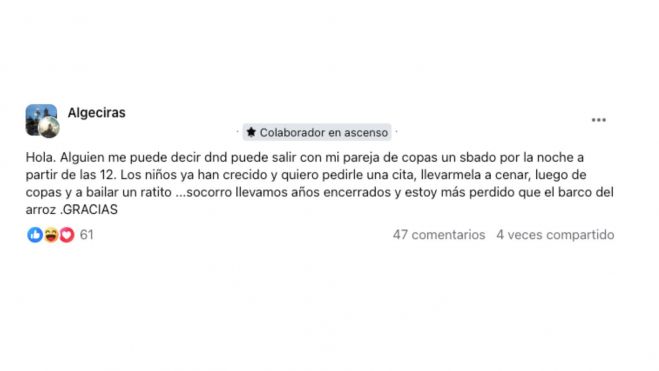 Este usuario en cuestión realizaba la siguiente consulta: "¿Alguien me puede decir dónde puedo salir con mi pareja un sábado por la noche a partir de las doce? Los niños ya han crecido y quiero pedirle una cita, llevármela a cenar, luego de copas y bailar un ratito. Socorro, llevamos años encerrados y estoy más perdido que el barco del arroz. Gracias".