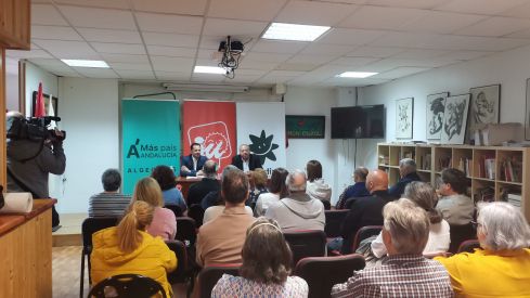 El candidato de Izquierda Unida, Más País e Iniciativa del Pueblo Andaluz a la alcaldía de Algeciras, Andrés del Río, y el experto en gestión de servicios públicos, Santiago Gutiérrez, han defendido la gestión directa de los servicios públicos en el transcurso de un acto público con una importante concurrencia de responsables sindicales y vecinales.