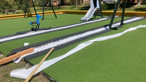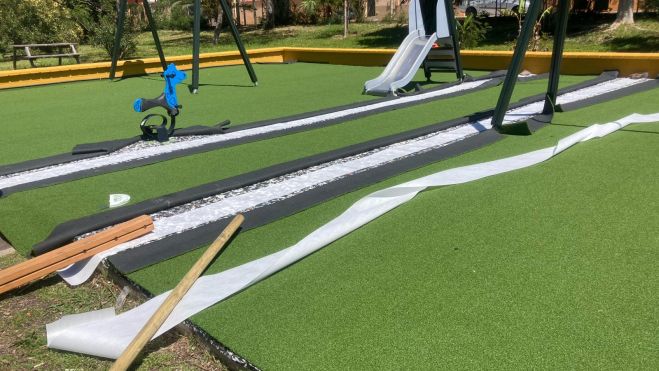 Una vez retirado el suelo de caucho los operarios de la empresa Urbaser, concesionaria del mantenimiento de parques y zonas verdes de la ciudad, han procedido a la colocación en cada recinto de una base elástica de proplay, para posteriormente instalar el césped artificial.