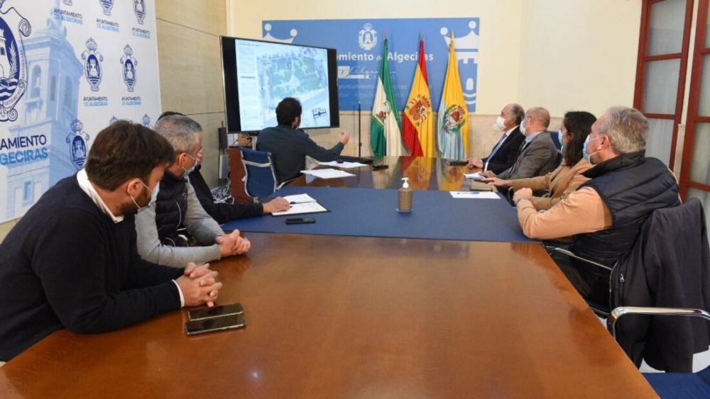 El alcalde, José Ignacio Landaluce, acompañado de la delegada de Urbanismo, Yéssica Rodríguez y el delegado de Parques y Jardines, Ángel Martínez, ha mantenido un encuentro de trabajo junto con los técnicos municipales para avanzar en el proyecto intetegral de reforma y modernización del histórico Parque María Cristina de Algeciras en el que se viene trabajando.