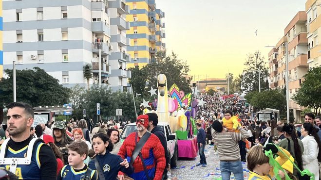 Salió desde la avenida Virgen del Carmen y se encaminó hasta la avenida Fuerzas Armadas, con mucho público que aguardaba la llegada de la cabalgata. La primera parte divirtió especialmente a los pequeños, con las pistolas de serpentinas, los gigantescos insectos y mucho mucho papelillo. Nadie se escapaba de ellos al paso de las primeras carrozas. La del Dios Momo, las del pregonero Fran Amado disfrazado de la estatua de Paco de Lucía, las de las peñas como Los Buyitas o La Novia del Sol. Y entre ellas, juegos y alegría.