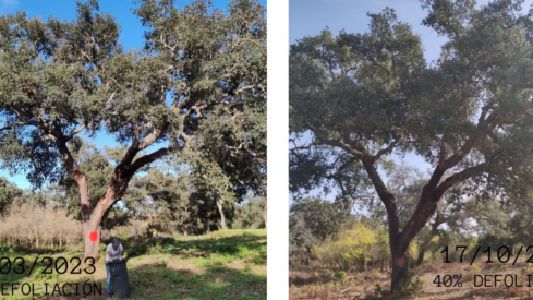 De los seis árboles tratados en la parcela Los Orgarzos, en la Finca La Almoraima, cinco han remontado tras aplicar el fertilizante fabicado a base de alga y exhiben una mejora en la cantidad de hojas y brotes.