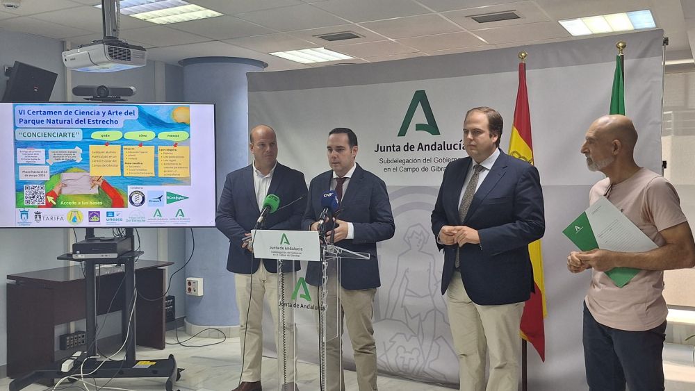 El viceconsejero de Sostenibilidad, Sergio Arjona, junto al delegado territorial de Sostenibilidad y Medio Ambiente en Cádiz, Óscar Curtido; el director del Parque Natural del Estrecho, Jorge Serradilla; y el concejal de Medio Ambiente del Ayuntamiento de Algeciras, Javier Vázquez, han dado a conocer todos los detalles de esta sexta edición del concurso, en el que pueden participar todos los alumnos de los centros escolares del Campo de Gibraltar, que tienen hasta el próximo 15 de mayo para presentar sus trabajos.