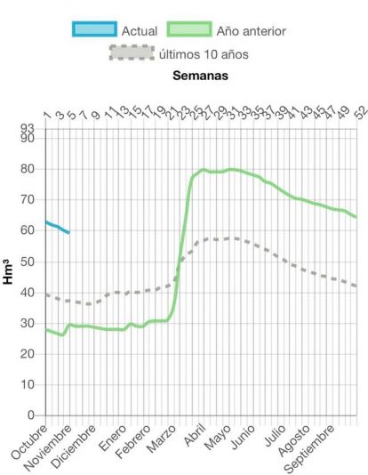 Sin embargo, las importantes lluvias registradas la pasada primavera mantienen mejores cifras que las preocupantes del pasaso año: en la misma semana de 2024 tenía 26 hectómetros cúbicos, al 29,55% de su capacidad, e incluso mejora los registros de hace 10 años, cuando estaba al 41%.