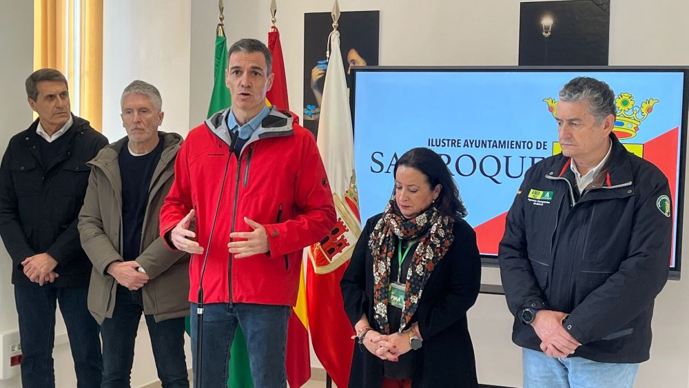 El presidente del Gobierno, Pedro Sánchez, ha comparecido ante los medios de comunicación este mediodía del viernes tras la reunión celebrada en el puesto de mando avanzado situado en San Roque, donde se ha evaluado la situación de los municipios del Campo de Gibraltar afectados por el temporal. Sánchez ha asegurado que hay desplegado un dispositivo de más de 10.000 efectivos en la provincia desde el inicio de la crisis, en "perfecta coordinación" con la Junta de Andalucía y la Diputación Provincial, y que ya piensa en la reconstrucción de las zonas afectadas.