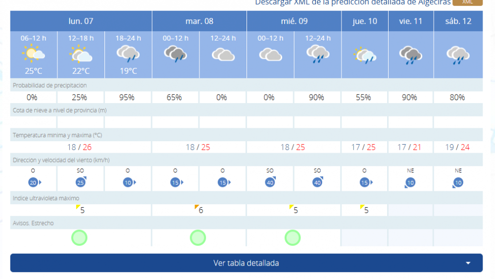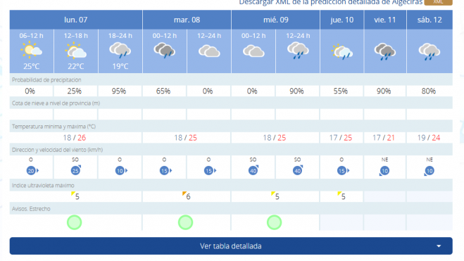 Las previsiones de la Aemet indican que las precipitaciones comenzarán esta misma madrugada y el tiempo lluvioso tendrá continuidad al menos hasta el sábado. A partir de las 02.00 horas se espera que empiece a llover con un 90% de probabilidades. Miércoles, viernes y sábado se presentan con más de un 80% de posibilidades de que llueva también. Soplará viento de Poniente hasta el viernes cuando haga su aparición el Levante.