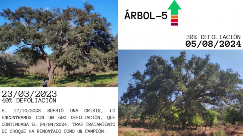 El pasado marzo de 2023 comenzaron a tratar seis alcornoques enfermos con una fermentación artesanal hecha de alga invasora asiática Rugulopteryx okamurae. Tras más de un año de cuidado, este lunes 5 de agosto los investigadores del proyecto han podido observar que todos los alcornoques tratados han mejorado, aumentado el número de sus hojas y sus brotes. Dos de ellos incluso han remontado saliendo de la UCI forestal. Estos resultados traen consigo una valoración muy positiva del proyecto.