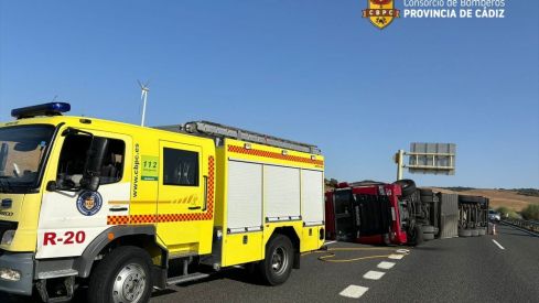 El vuelco de un camión en la A-381 sentido Algeciras obliga a cortar el carril derecho. El siniestro ha ocurrido en el término municipal de Alcalá de los Gazules y no hay que lamentar heridos.