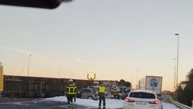 El accidente ha ocurrido en la mañana de este lunes 8 de diciembre sobre las 6.40 horas cuando un camión ha acabado volcado en la vía, ocupando los tres carriles en el kilómetro 1115 de la A-7, justo en la salida de Algeciras dirección San Roque. Según apuntan algunas llamadas al servicio de emergencias, un turismo podría haber colisionado con el camión siniestrado, que no llevaba mercancía peligrosa en el contenedor.