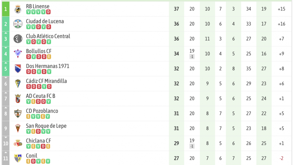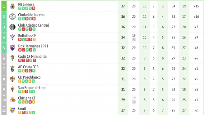 La Real Balompédica Linense se mantiene en lo más alto de la clasificación del grupo X de Tercera Federación tras viente jornadas disputadas y pese a perder en casa de la AD Ceuta B por 2-0. Un revés que corta una magnífica racha de 17 jornadas consecutivas sin conocer la derrota pero que, la del Ciudad de Lucena en Conil, no le cuesta el liderato.