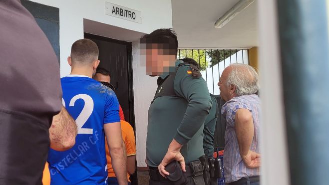 La acción ha sido considerada como falta por el trencilla, que ha mostrado la cartulina al cancerbero, con lo que le ha expulsado. En ese momento ha sido rodeado por varios futbolistas del cuadro amarillo y tras varias protestas y alguna roja (denuncia que Porrino le ha llegado a intimidar; y a Puyi por un presunto golpe con el hombro), ha decidido irse al vestuario solicitando la presencia urgente de la Guardia Civil.
