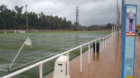 El choque, que debía comenzar a las 11:00 horas, no ha podido comenzar toda vez que el balón no rodaba en ninguna de las partes del terreno de juego, que ha soportado una gran cantidad de agua y estaba prácticamente anegado.