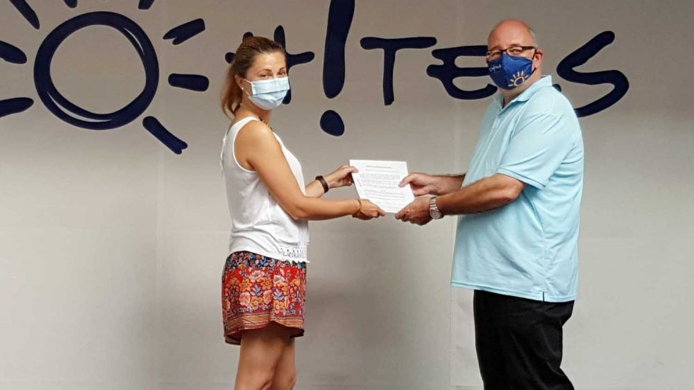 La firma se ha llevado a cabo en las oficinas de la plaza hostelera del OH!Tels Campo de Gibraltar, entre Dimitri Van Den Berghe director del mismo y Virginia Rodríguez, presidenta de la entidad.