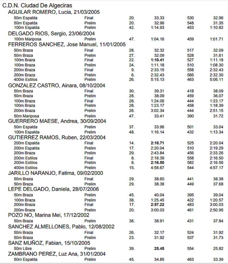 La tercera y última jornada del XXXVI Campeonato de Andalucía Junior-Absoluto para el Club Deportivo Natación Ciudad de Algeciras se saldó ayer domingo con la sexta plaza en categoría junior (octavo en absoluto) de Rubén Gutiérrez Ramos en los 200 metros Estilos donde, en semifinales, batió su anterior marca, logrando parar el cronómetro en 2:16.50 (iba con 2:16.56).