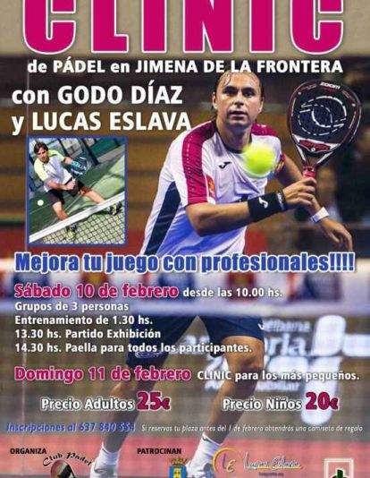 El Club de Pádel Jimena organiza la "Clinic de Pádel en Jimena de la Frontera", con Godo Díaz y Lucas Eslava, el próximo sábado 10 y domingo 11 de febrero de 2018, para adultos y para los más pequeños. El precio de inscripción es de 25€ para adultos y 20€ para niños. Las inscripciones y demás información pueden obtenerla en el teléfono 637 840 554.