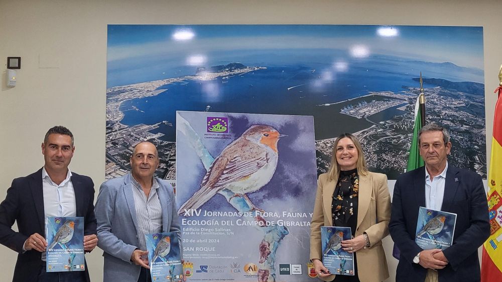 La presidenta de la Mancomunidad de Municipios del Campo de Gibraltar, Susana Pérez Custodio, junto al delegado de Medio Ambiente de San Roque, Juan José Serván, el vicepresidente comarcal de Cultura, Pablo García y el director del IECG y presidente de la sección 10ª, Eduardo Briones, han presentado las XIV Jornadas de Flora, Fauna y Ecología del Campo de Gibraltar.