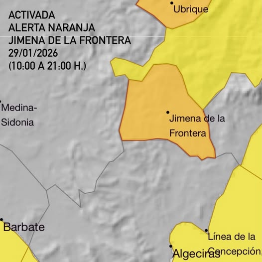 El Ayuntamiento de Jimena de la Frontera ha informado de la activación de la alerta naranja en el municipio para este jueves 29 de enero de 2026, según los datos publicados por la AEMET. El aviso estará vigente entre las 10:00 y las 21:00 horas por un episodio de lluvias intensas y fuertes rachas de viento.