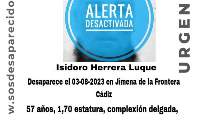 La plataforma SOS Desaparecidos ha desactivado la alerta de la desaparición Isidoro Herrera Luque, el vecino de Jimena que se encontraba en paradero desconocido desde el pasado día 3 de agosto.