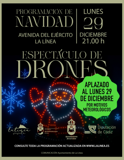 El Ayuntamiento de La Línea de la Concepción ha anunciado en sus redes sociales el aplazamiento del esperado espectáculo de drones previsto para la noche de mañana viernes en la Avenida del Ejército. La decisión se ha tomado debido a las condiciones meteorológicas adversas previstas para los próximos días.