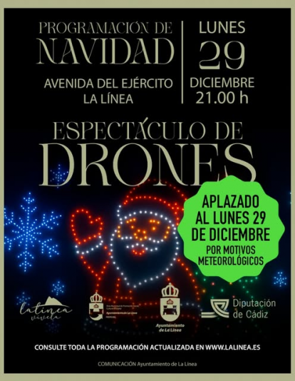 La Línea de la Concepción continuará, si el tiempo lo permite, brillando con las numerosas actividades navideñas. El próximo lunes, 29 de diciembre, a las 21.00 horas, se celebrará el espectáculo de drones, mientras que el día 30 tendrá lugar las precampanadas.