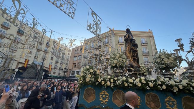 Pocos minutos después de las 17.00 horas la Inmaculada Concepción ha salido de su templo bajo la atenta mirada de decenas de personas agolpadas en la plaza de la Iglesia.