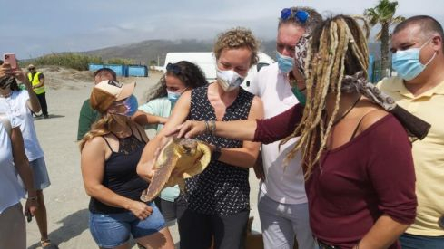 La concejal de Medio Ambiente, Raquel Ñeco, y el delegado municipal de Playas, Rafael León, han asistido al retorno al mar de un tortuga boba que ha pasado por un periodo de recuperación de cuatro meses en el Centro de Gestión del Medio Marino Andaluz (Cegma) de Algeciras.