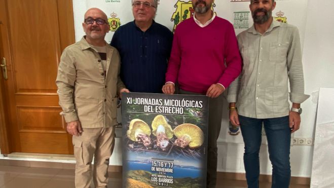 El primer edil de Los Barrios, Miguel Alconchel; el delegado de Educación, Raúl Álvarez, y el presidente de la Asociación Micológica ‘Mairei’, José Antonio Valle Viana, han dado a conocer el cartel y la programación de las XI Jornadas Micológicas del Estrecho, organizadas por dicho colectivo con la colaboración de la delegación de Medio Ambiente del Ayuntamiento barreño. Estas jornadas se desarrollarán, como cada año, en el hotel ‘Montera Plaza’, los días 15, 16 y 17 de este mes de noviembre.