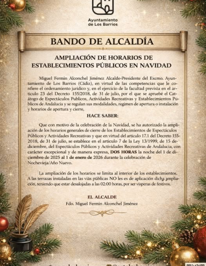 El Ayuntamiento de Los Barrios ha informado a vecinos y hosteleros de la publicación de un nuevo Bando de Alcaldía, emitido por el alcalde Miguel Fermín Alconchel Jiménez, con motivo de las celebraciones navideñas y, en especial, de la noche de Nochevieja.