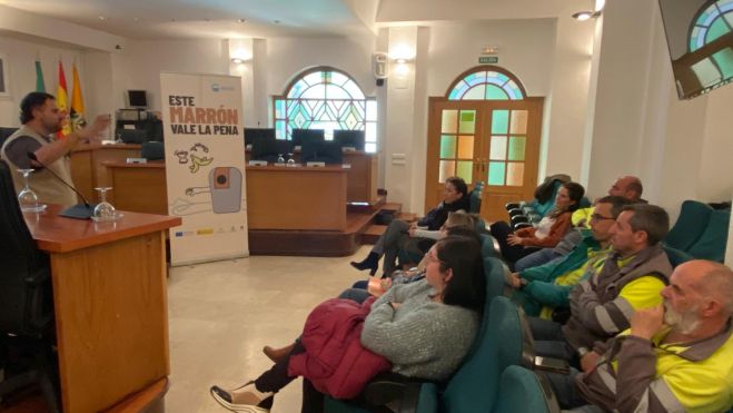 El salón de plenos del Ayuntamiento de Los Barrios ha acogido este miércoles 18 de marzo una sesión informativa dirigida específicamente a los trabajadores de las delegaciones de Limpieza y Mantenimiento Urbano sobre la llegada del nuevo contenedor de basura de color marrón al municipio.