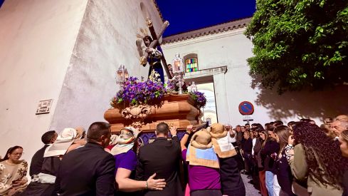 Su madre, sufridora, Dolorosa, salía minutos después de la Parroquia San Isidro Labrador. De nuevo, la ardua maniobra para los costaleros, que echaban el peso de su cuerpo hacia delante, en un ángulo agudo, para frenar el deslizamiento de los ruedines. El cambio a las patas se hace con celeridad, con buena parte del palio casi en vertical. Impresiona a la vista. “¡Ay, ay!”, decía una de las presentes, sorprendida por la perspectiva, y quizá algo atemorizada. Y es que, en efecto, la sensación es sobrecogedora. Pero lo tienen todo bajo control. La Banda de Música de Mijas pone banda sonora a una trabajada maniobra y da comienzo a la salida procesional.