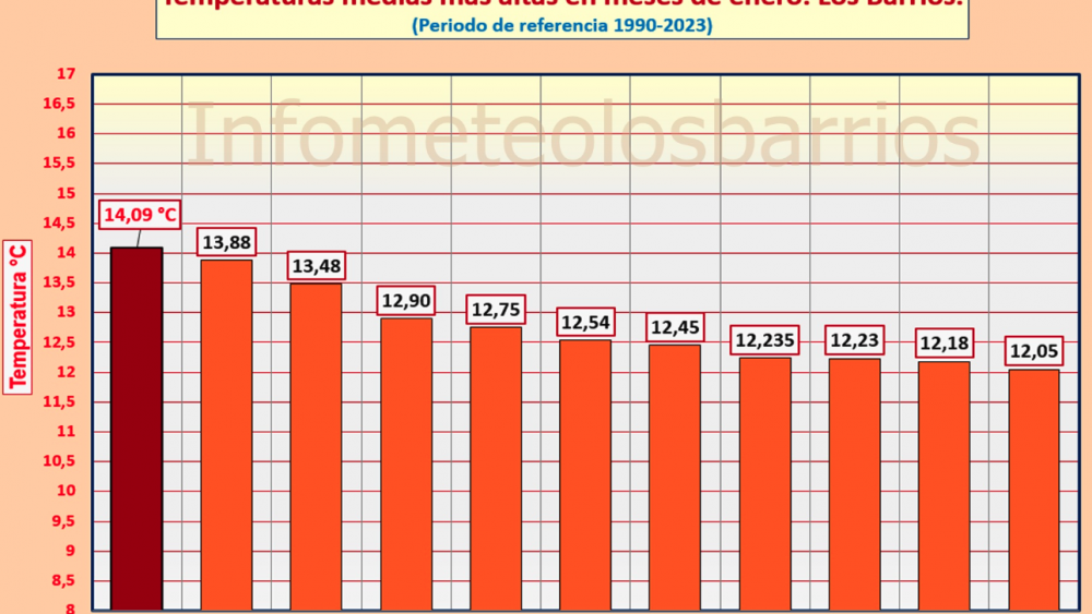 El mes de enero de 2024 pasará a la historia de Los Barrios como el más cálido del siglo XXI, según los datos del observatorio barreño recogidos por el portal InfometeoLosBarrios. La temperatura media registrada fue de 14,09 °C superando en 2,3 °C la media climática de referencia.